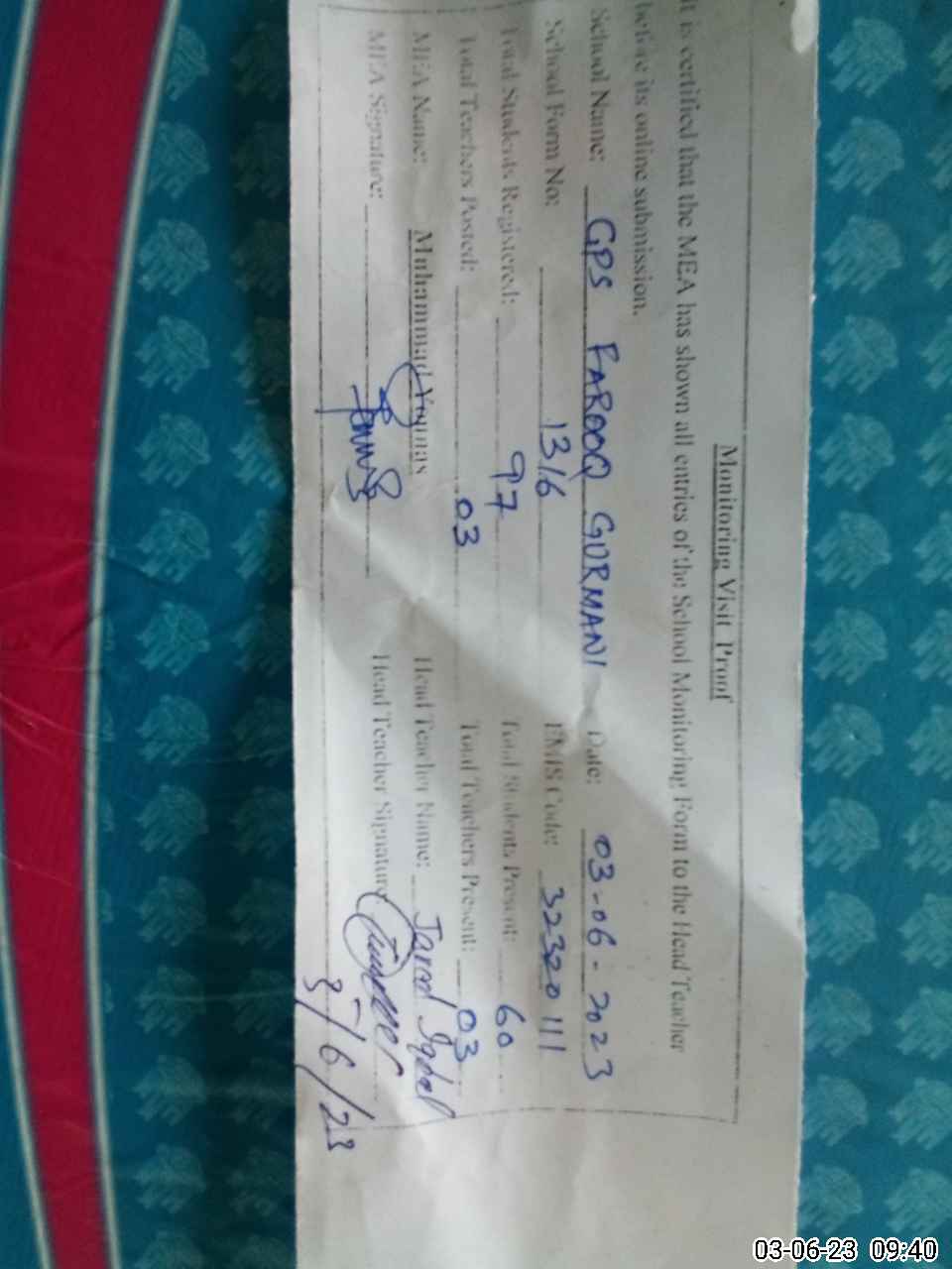 | Attendance Register | Head Teacher | MEA with School | Visit Proof |