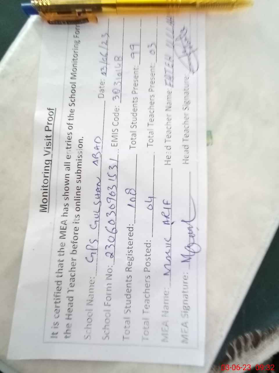 | Attendance Register | Head Teacher | MEA with School | Visit Proof |