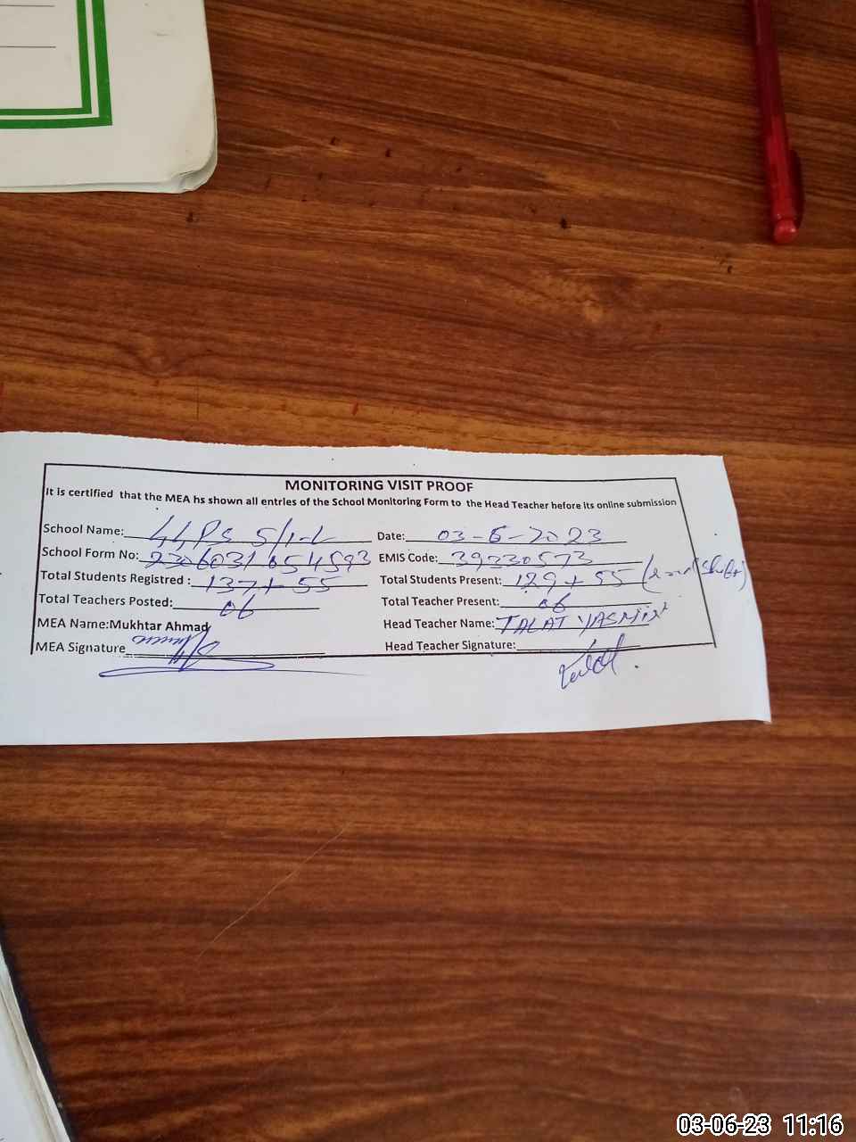 | Attendance Register | Head Teacher | MEA with School | Visit Proof |