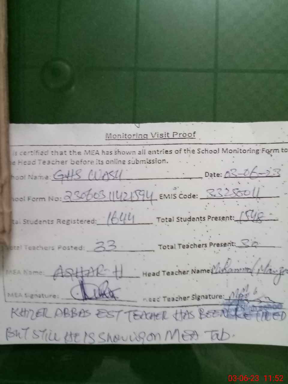 | Attendance Register | Head Teacher | MEA with School | Visit Proof |