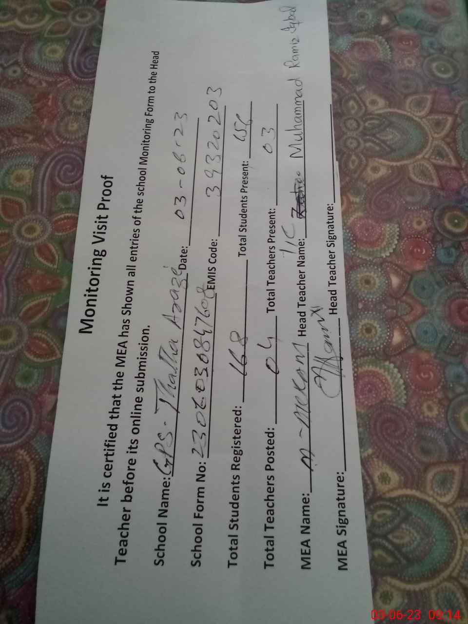 | Attendance Register | Head Teacher | MEA with School | Visit Proof |