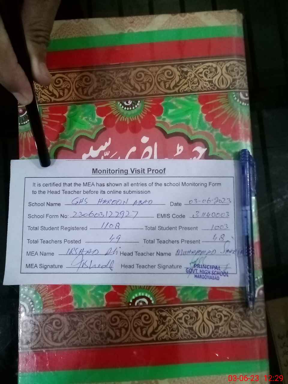 | Attendance Register | Head Teacher | MEA with School | Visit Proof |