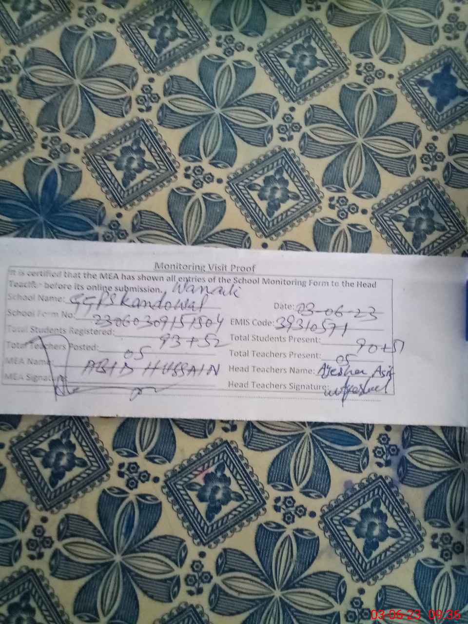 | Attendance Register | Head Teacher | MEA with School | Visit Proof |