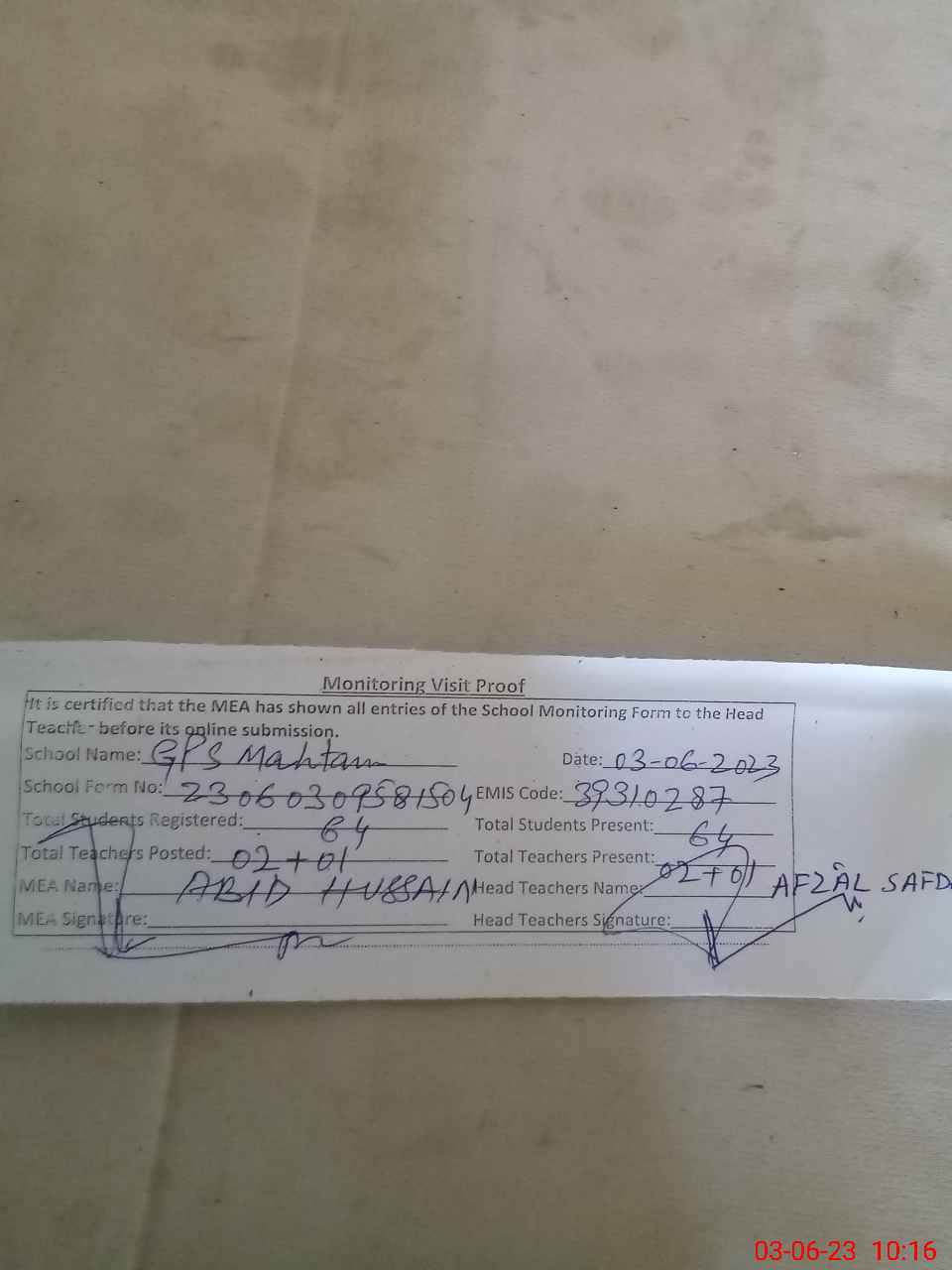 | EMIS Code: 39310287 | Name of School: GPS MAHTAM | |||