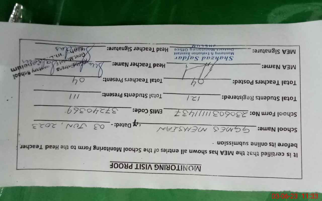| Certified that this School was Inspected by the Undersigned MEA/DMO Today and the Information Stated Above is as Per Record. | |||||