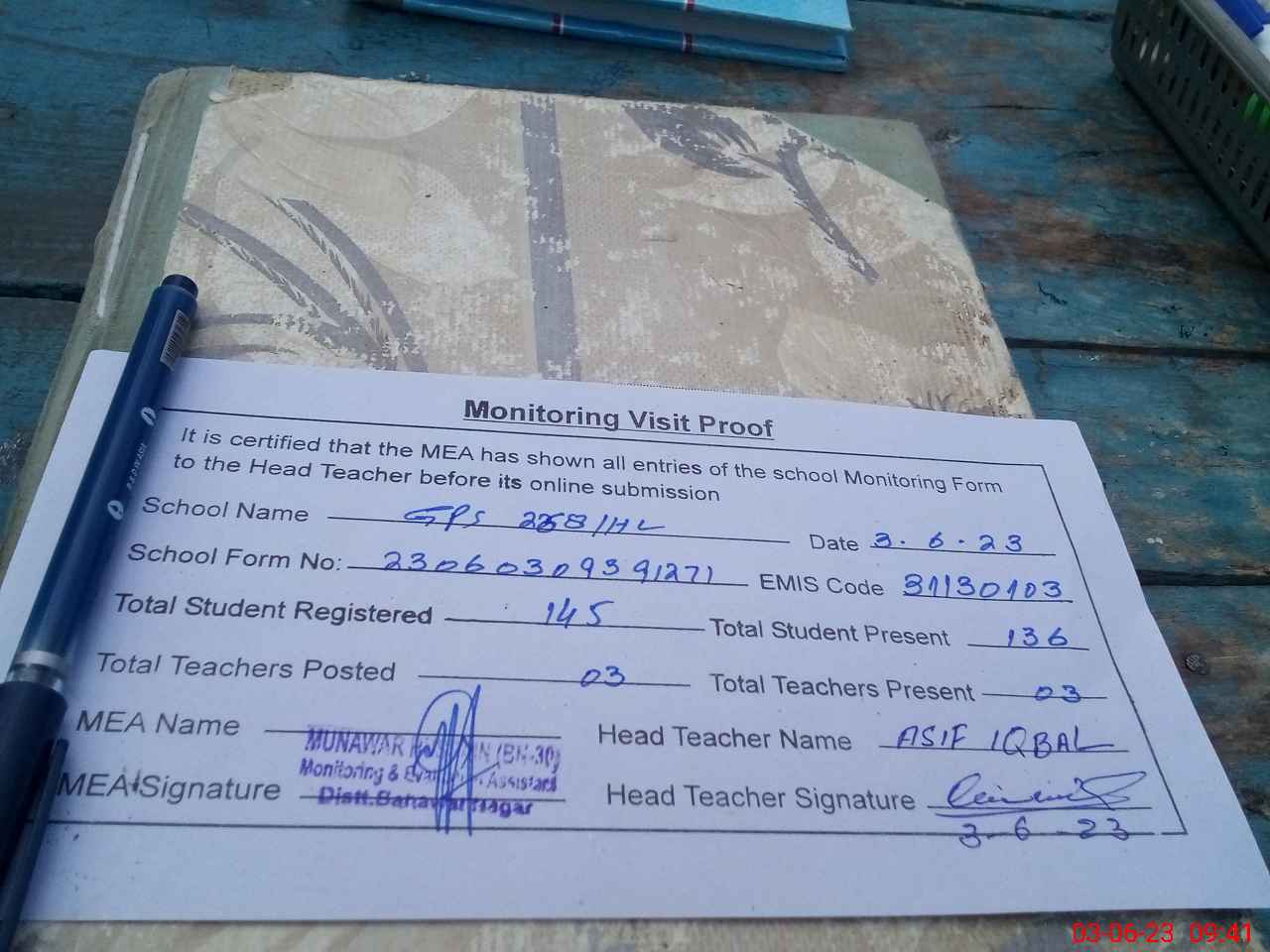 | Attendance Register | Head Teacher | MEA with School | Visit Proof |