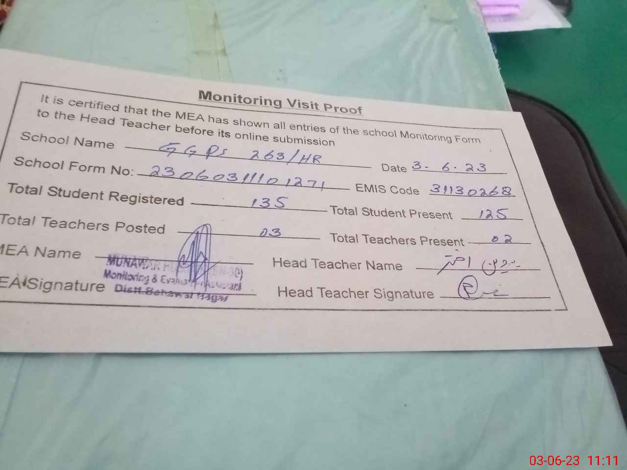 | Attendance Register | Head Teacher | MEA with School | Visit Proof |