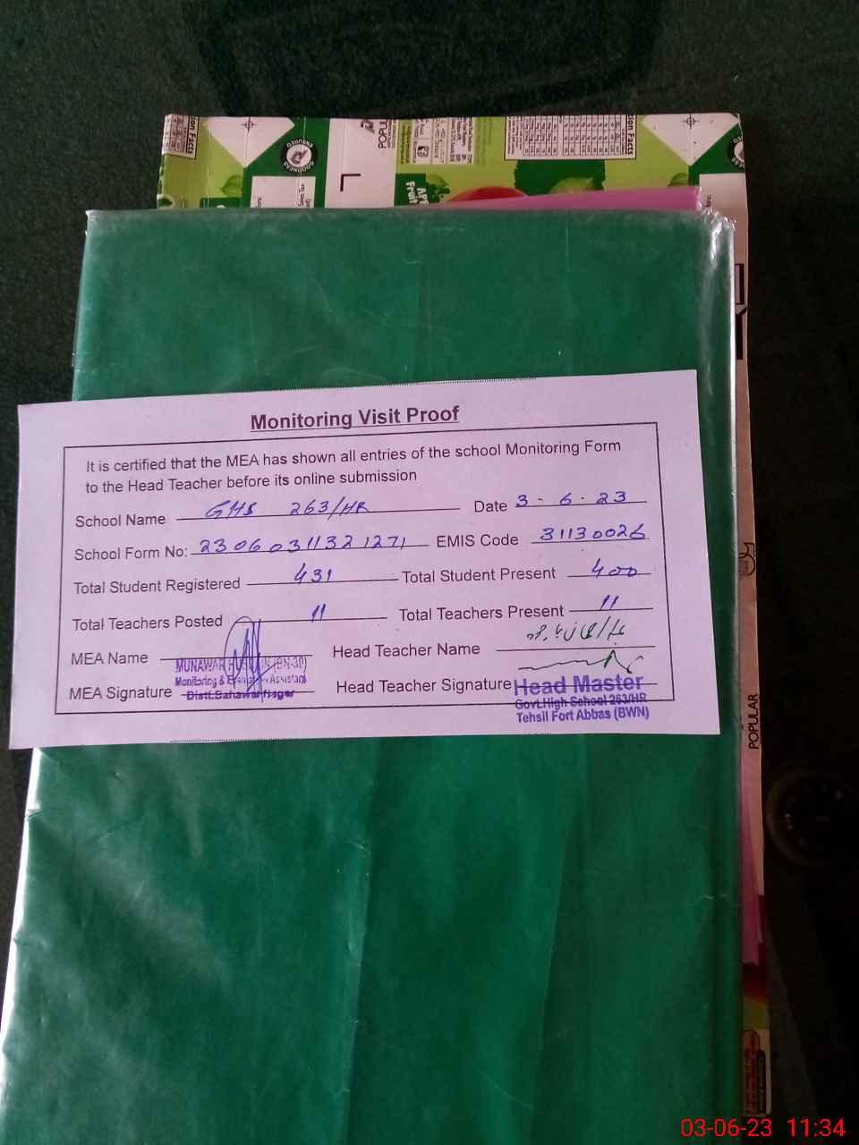 | Attendance Register | Head Teacher | MEA with School | Visit Proof |