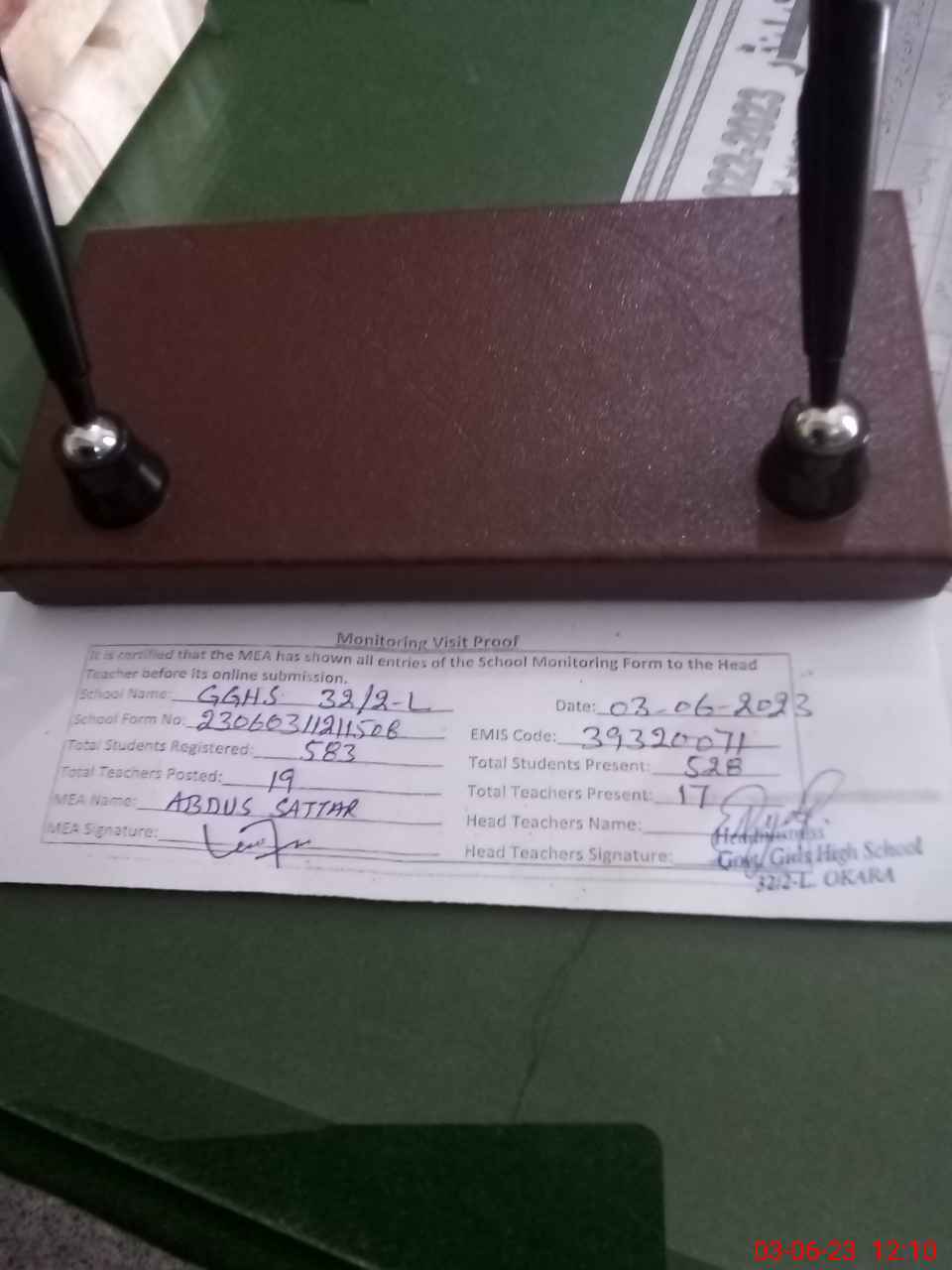 | Attendance Register | Head Teacher | MEA with School | Visit Proof |