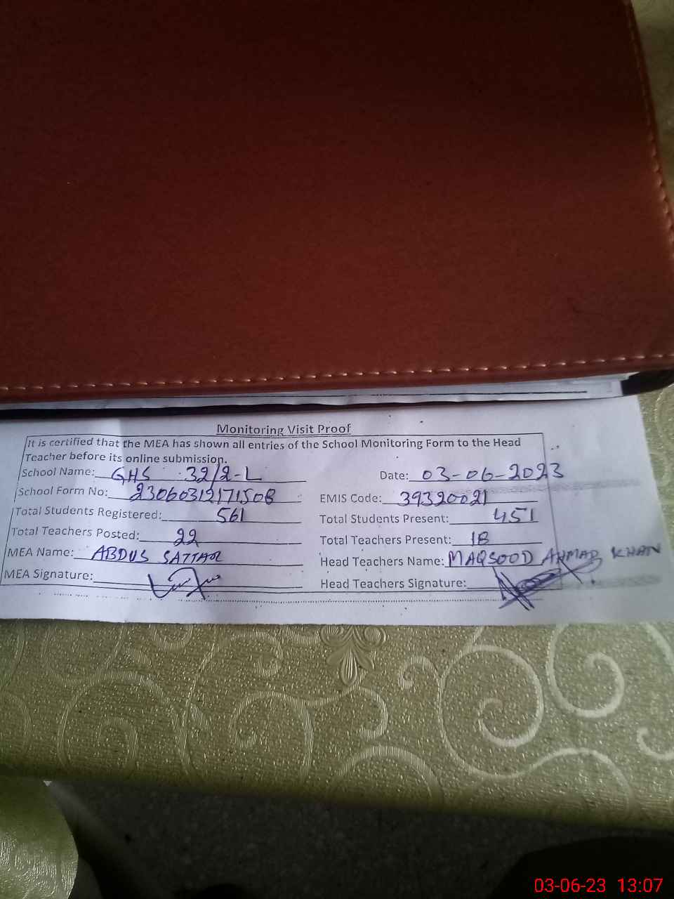 | EMIS Code: 39320021 | Name of School: GHS CHAK NO.32/2-L | |||