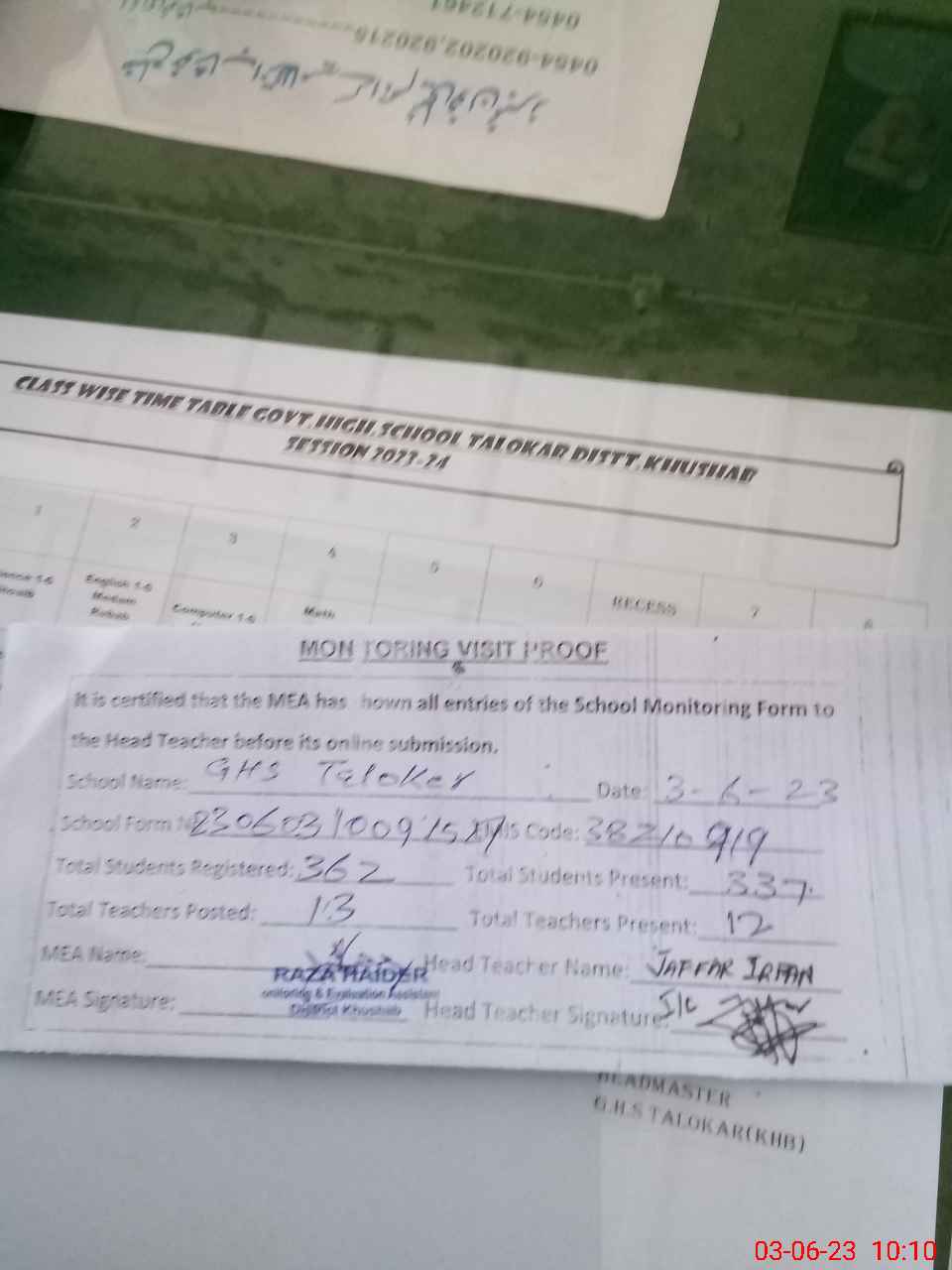 | EMIS Code: 38210919 | Name of School: GHS TALOKAR | |||