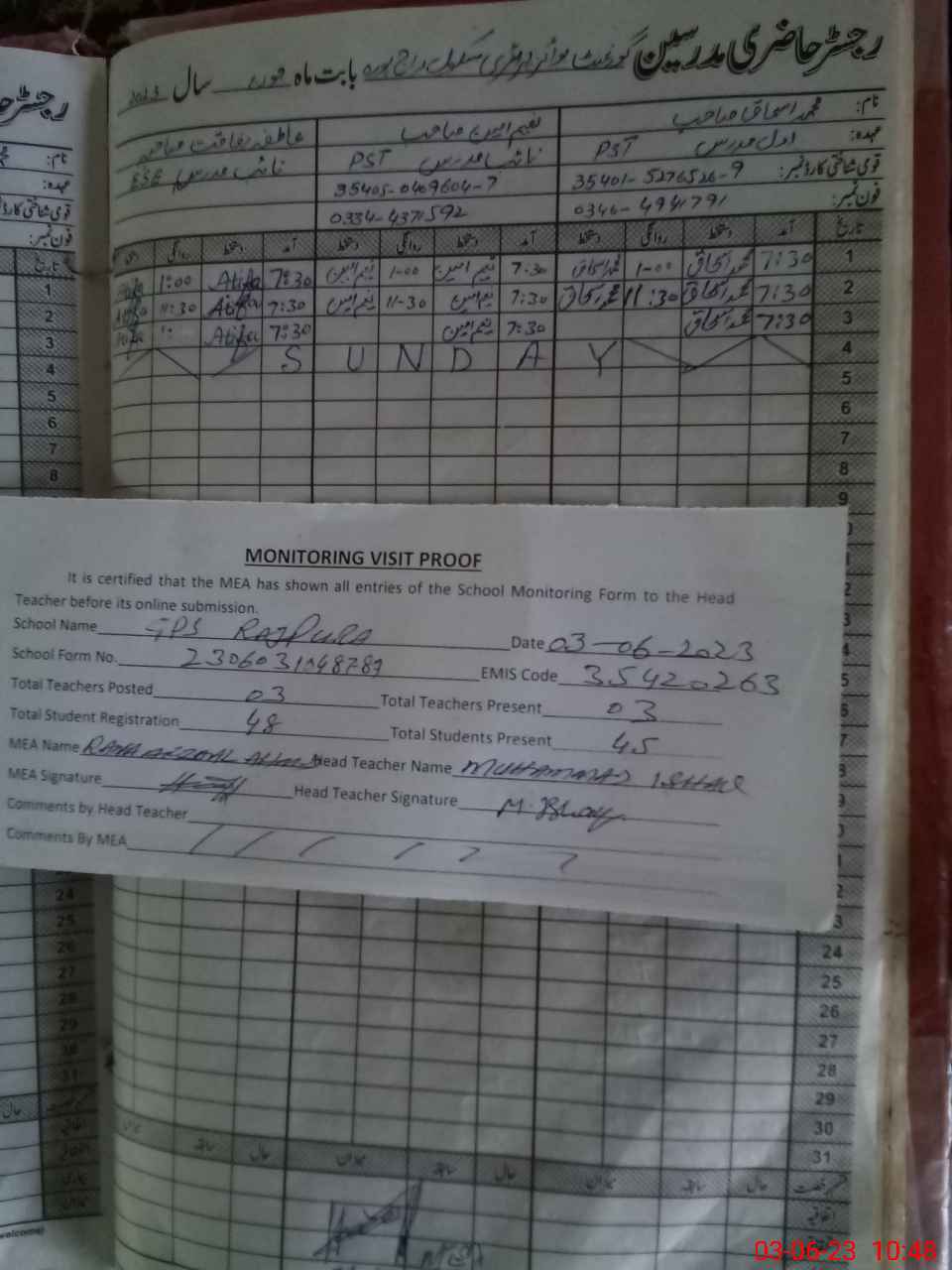| Attendance Register | Head Teacher | MEA with School | Visit Proof |