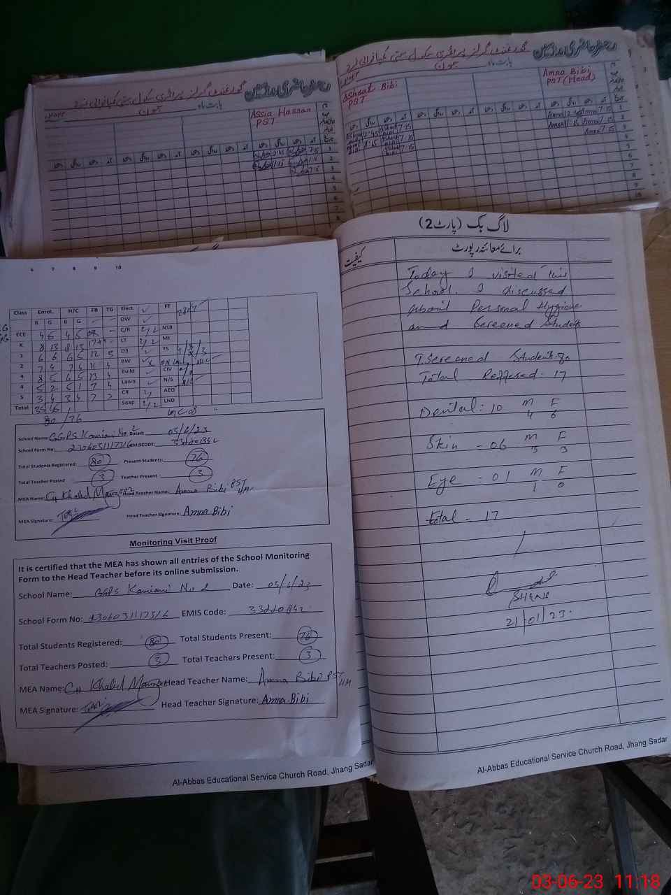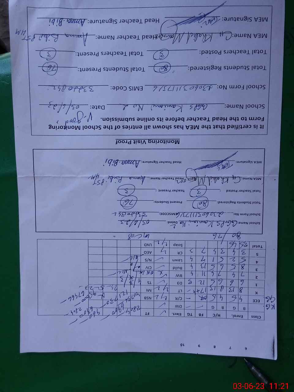 | Attendance Register | Head Teacher | MEA with School | Visit Proof |