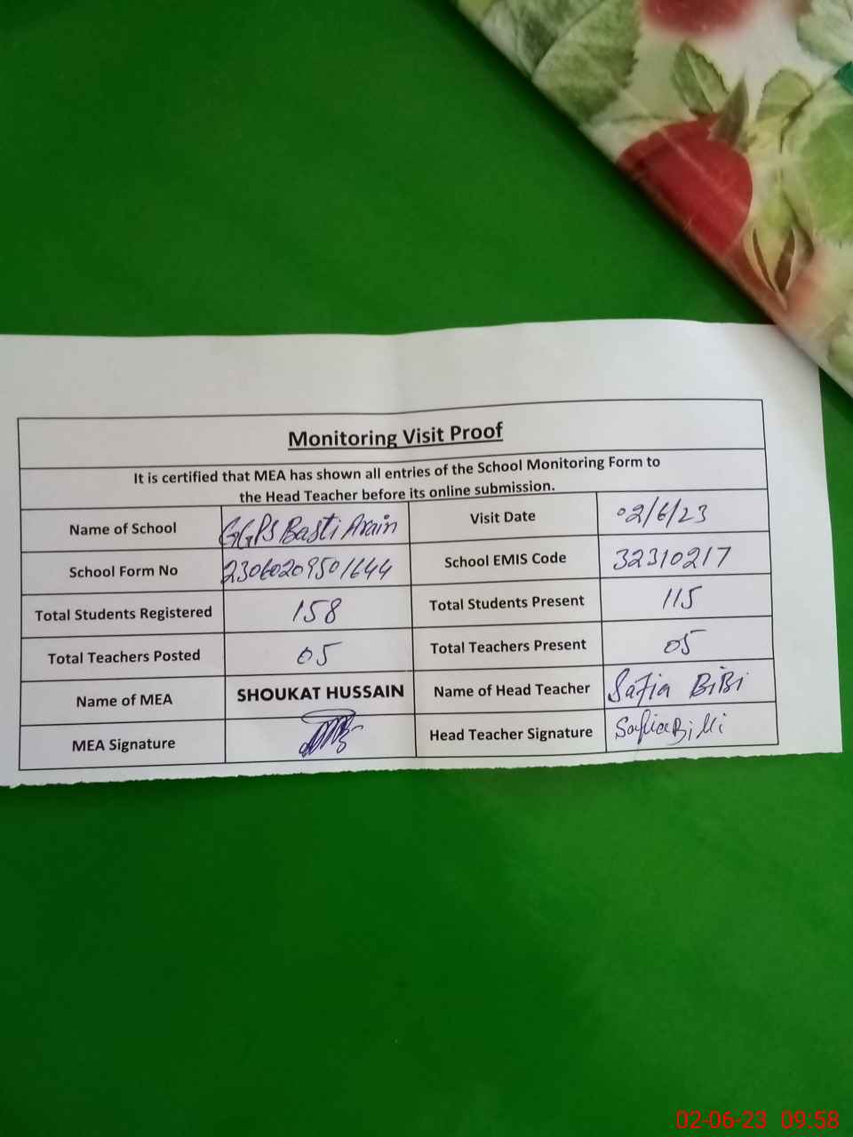 | EMIS Code: 32310217 | Name of School: GGPS BASTI ARAIN | |||