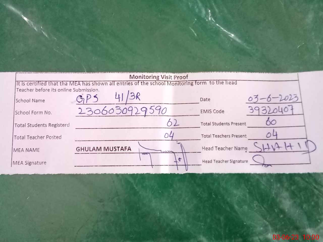 | Attendance Register | Head Teacher | MEA with School | Visit Proof |