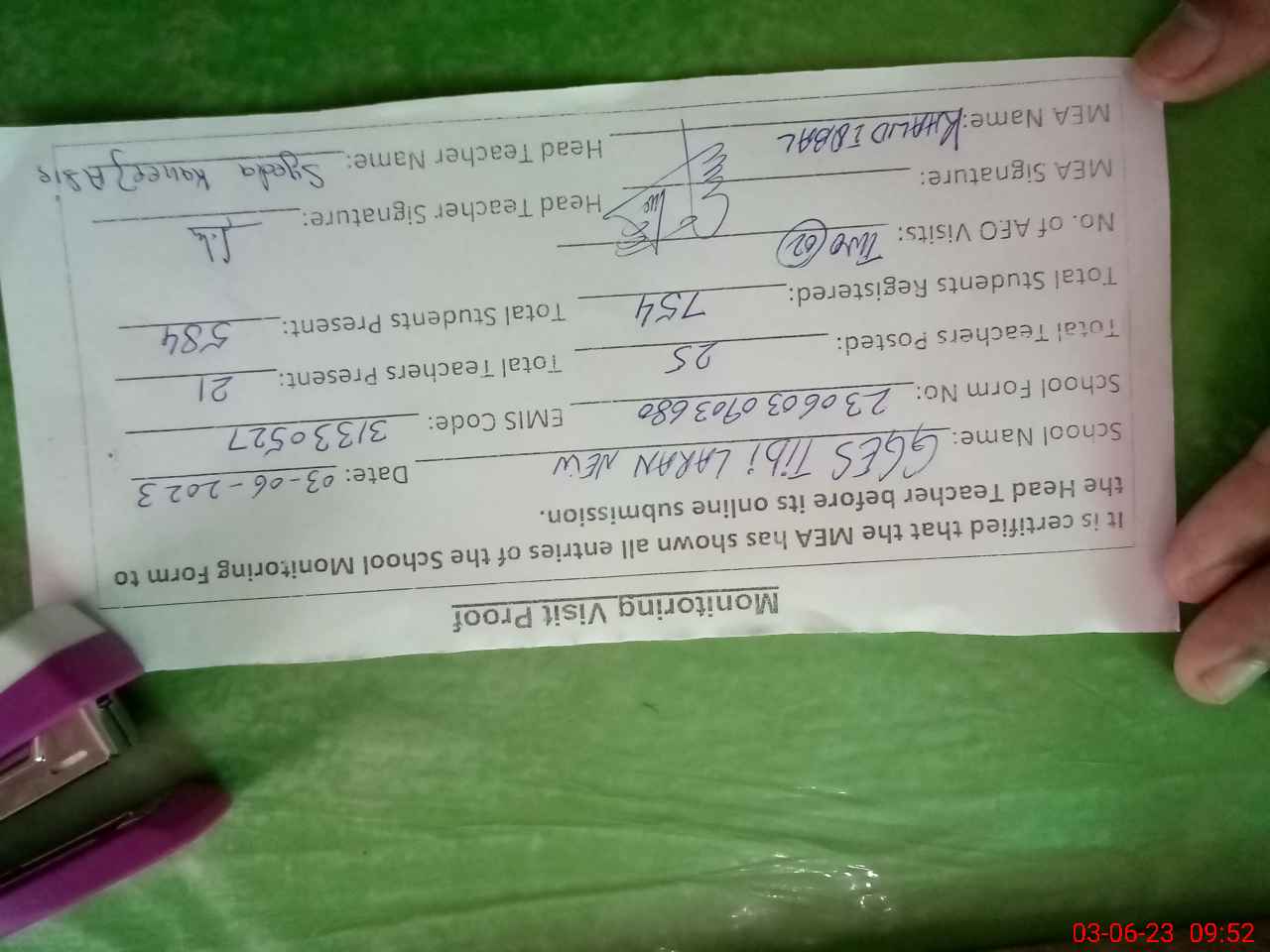 | Attendance Register | Head Teacher | MEA with School | Visit Proof |