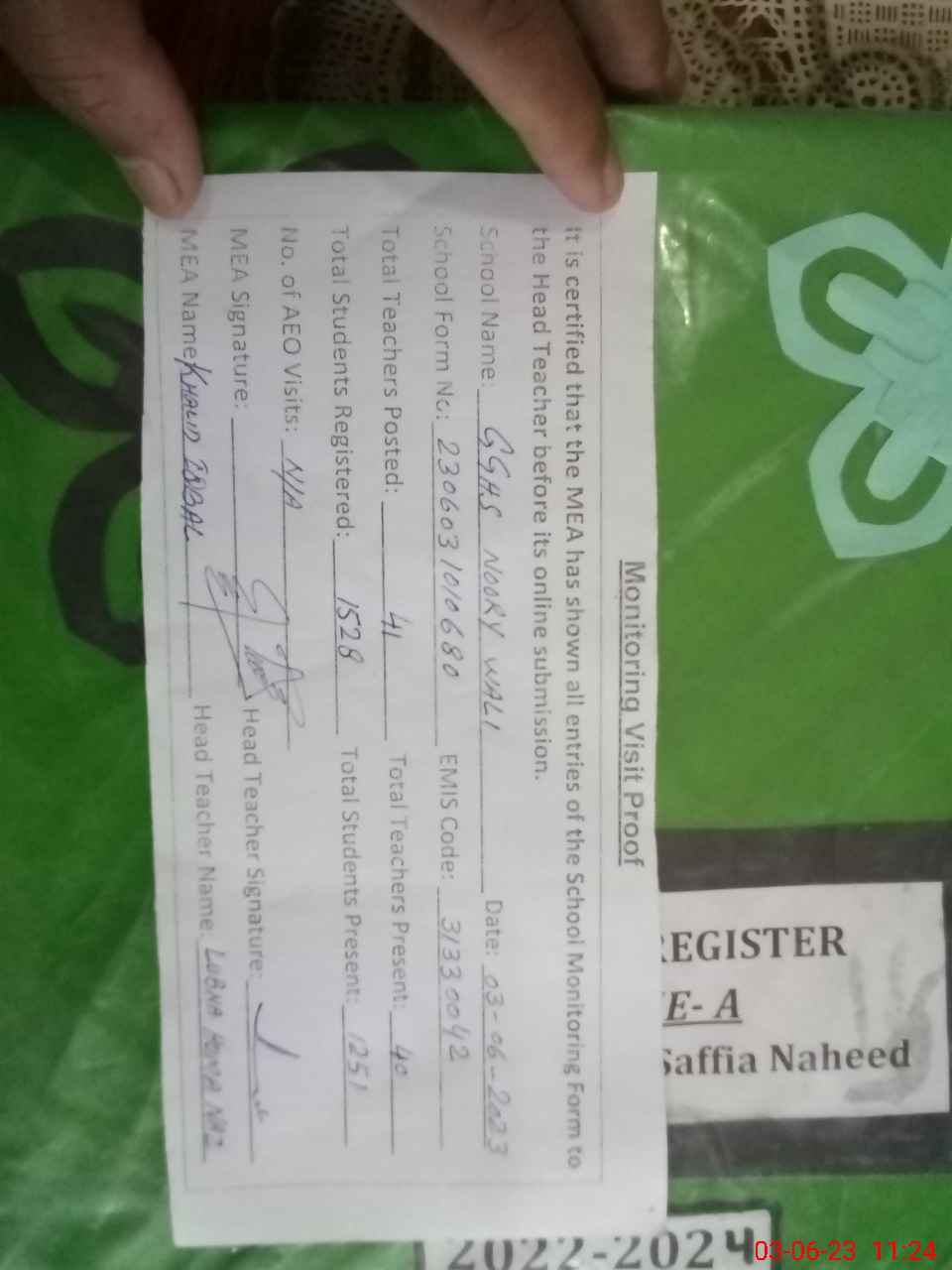 | Attendance Register | Head Teacher | MEA with School | Visit Proof |