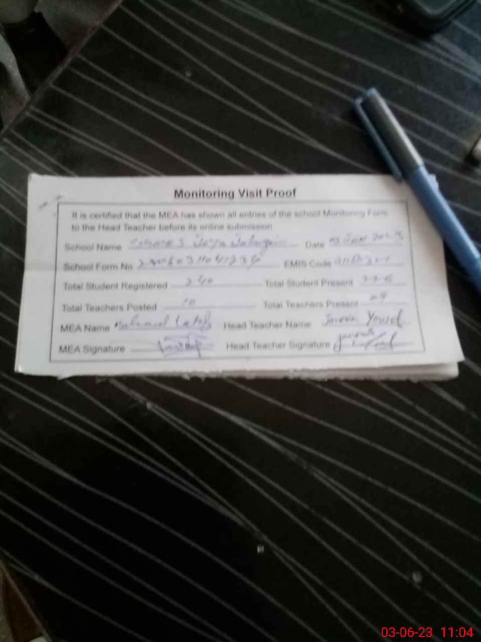 | Attendance Register | Head Teacher | MEA with School | Visit Proof |