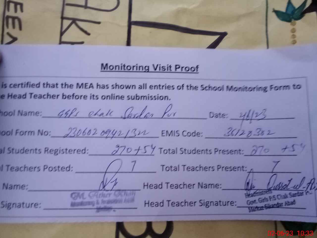 | Attendance Register | Head Teacher | MEA with School | Visit Proof |