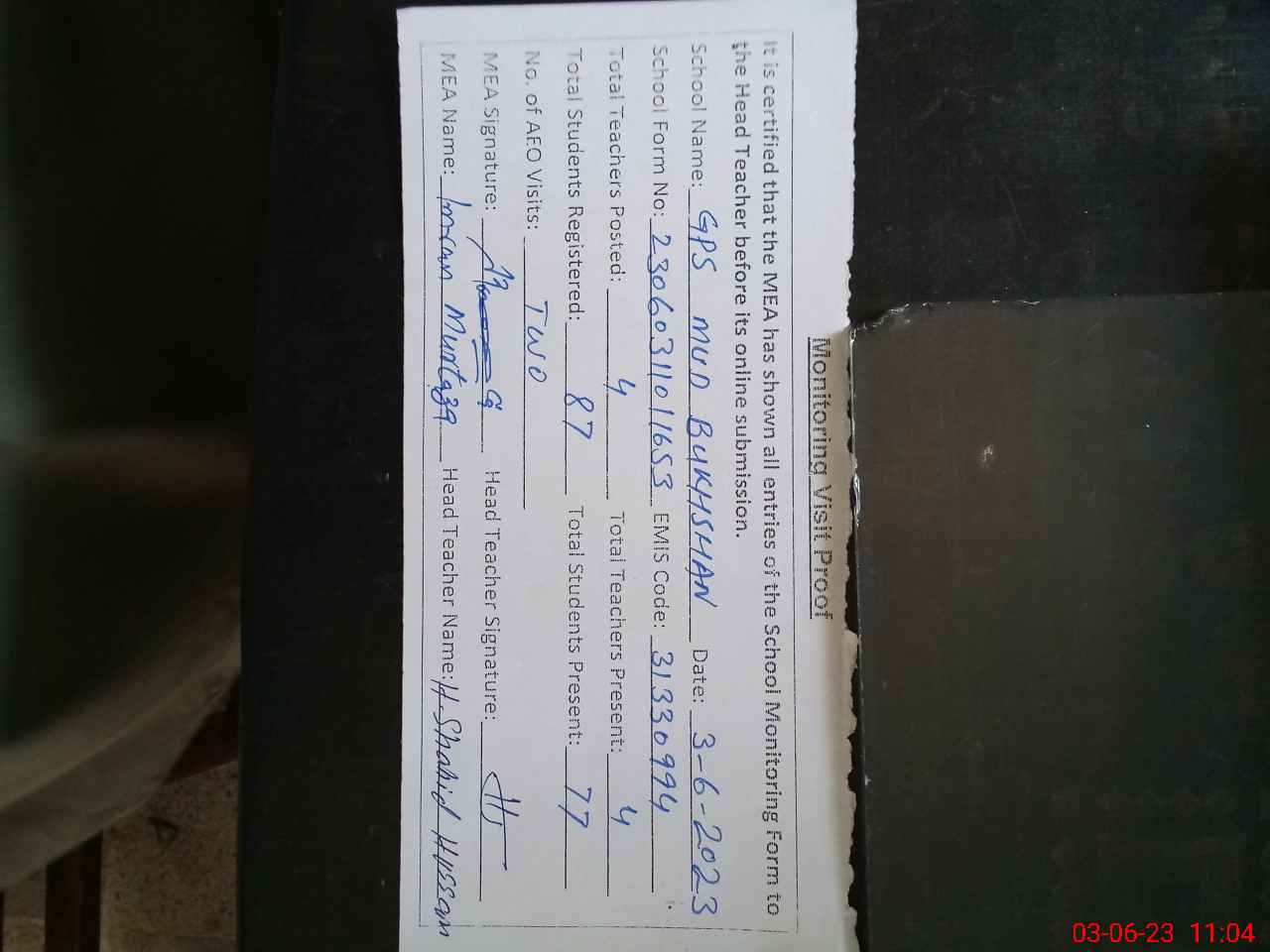 | Attendance Register | Head Teacher | MEA with School | Visit Proof |
