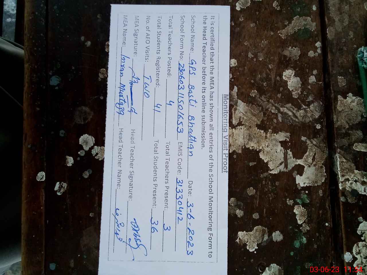 | Attendance Register | Head Teacher | MEA with School | Visit Proof |