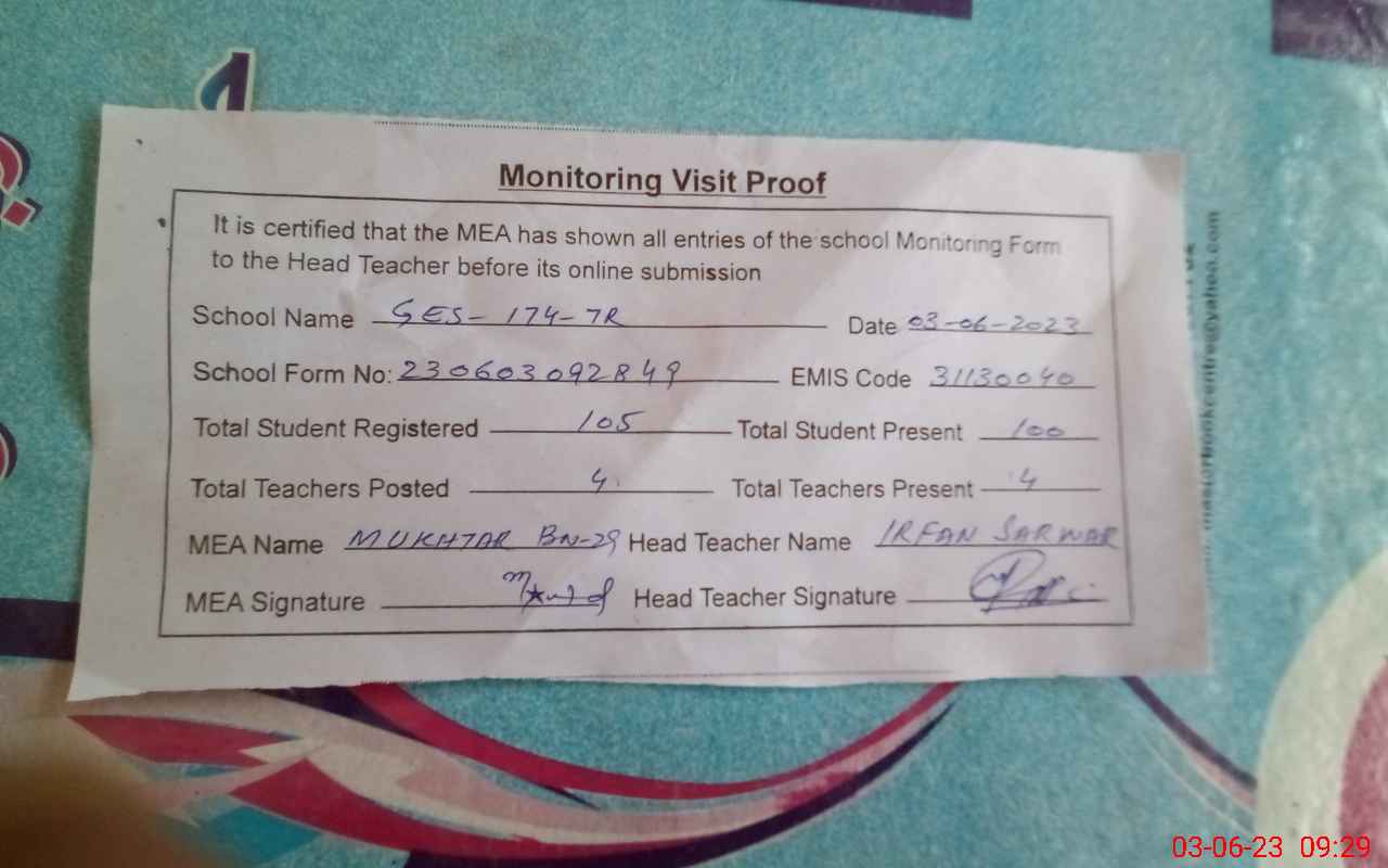 | EMIS Code: 31130040 | Name of School: GES CHAK 174/7-R | |||