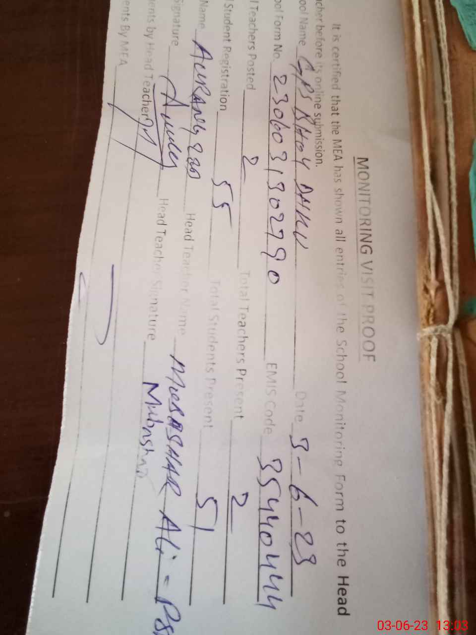 | Attendance Register | Head Teacher | MEA with School | Visit Proof |