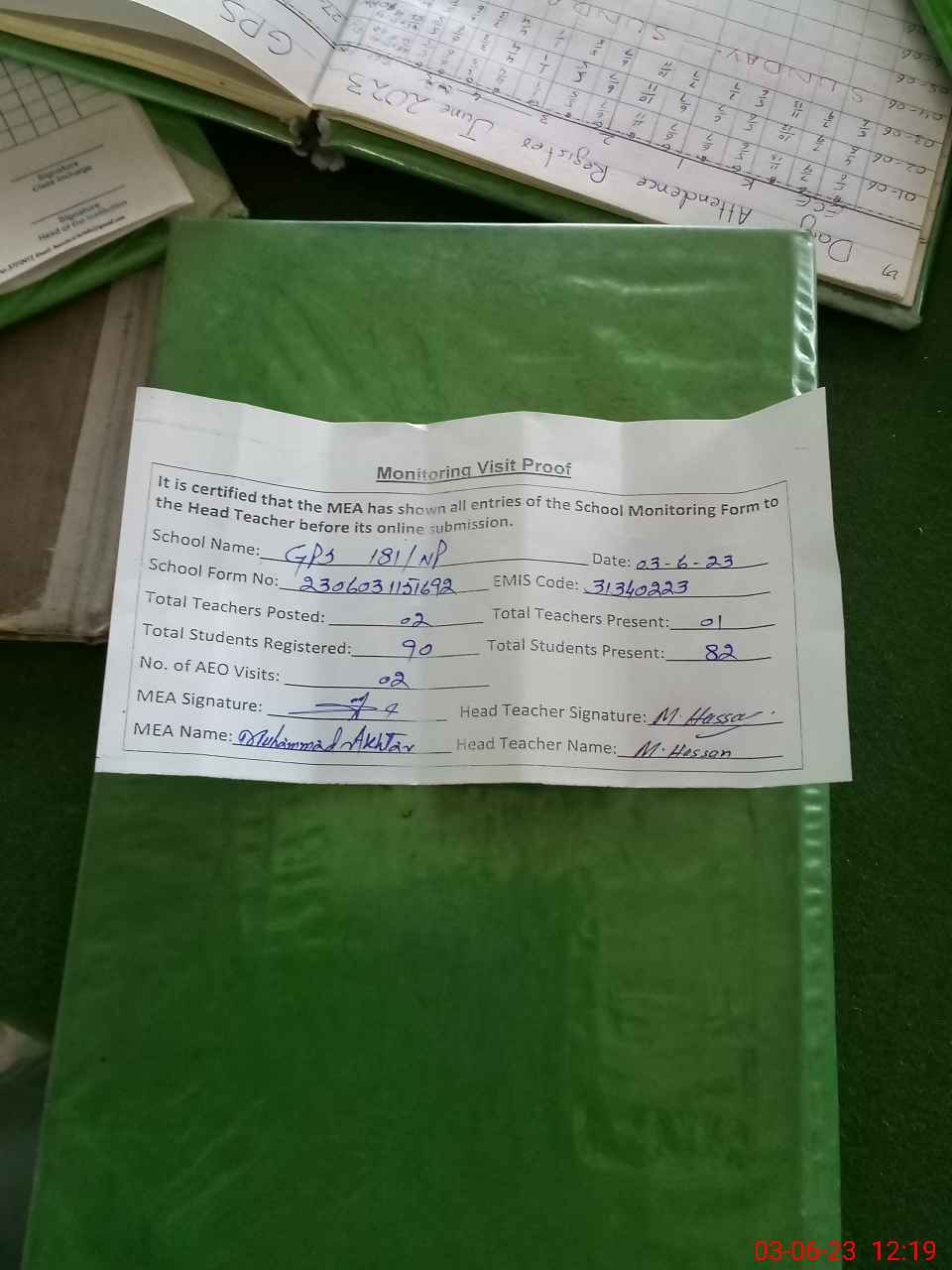 | Attendance Register | Head Teacher | MEA with School | Visit Proof |