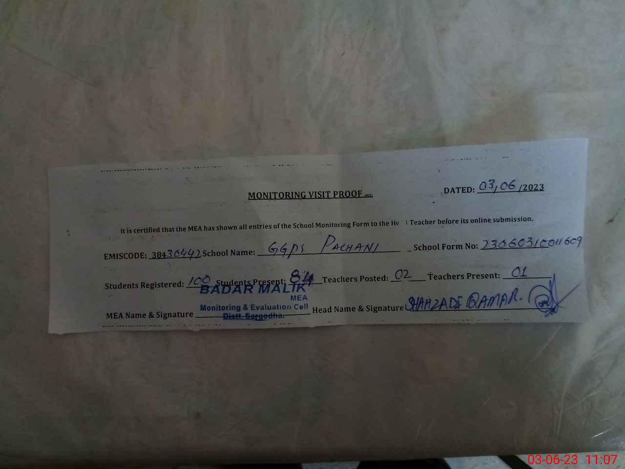 | Attendance Register | Head Teacher | MEA with School | Visit Proof |