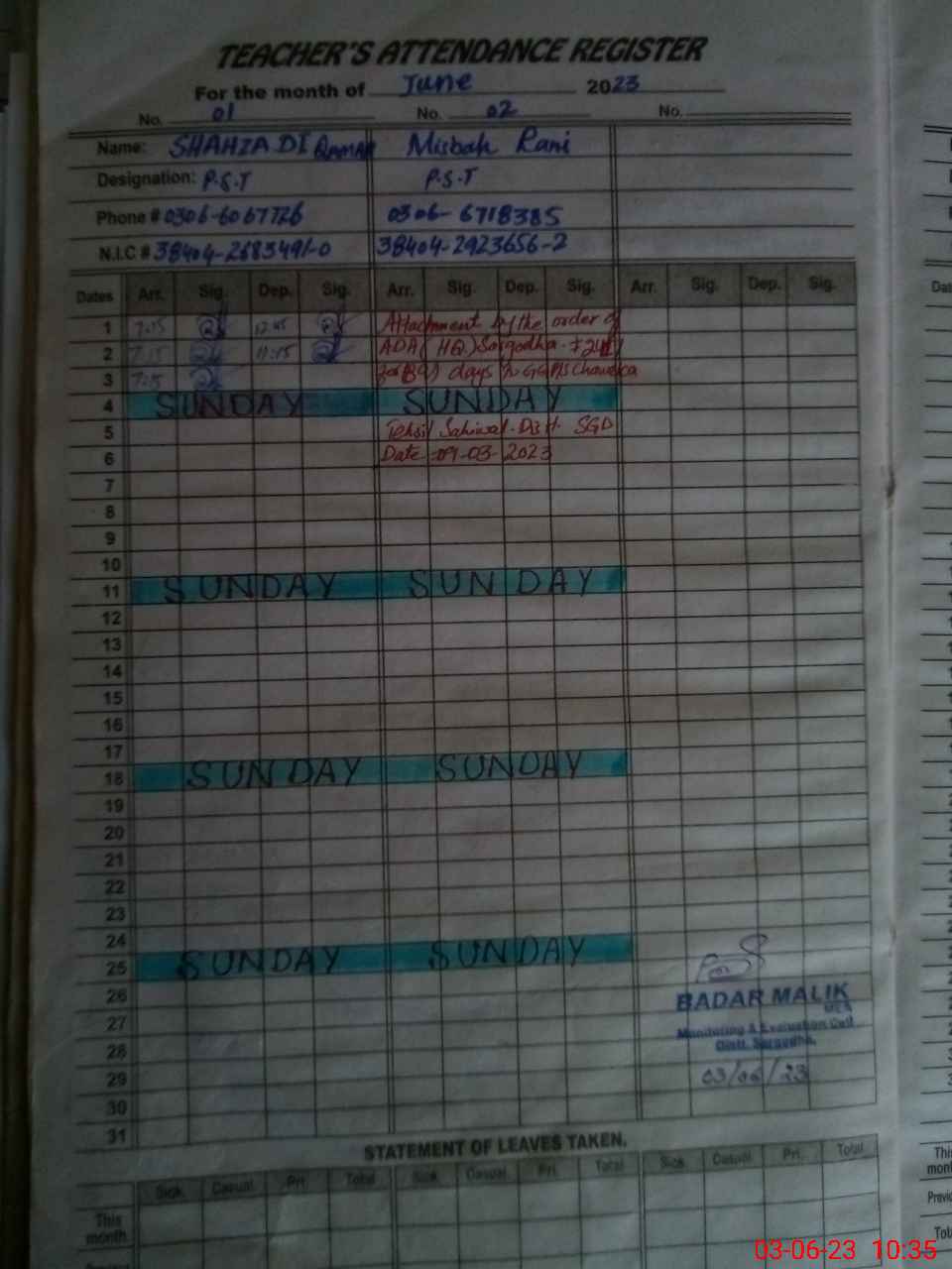 | Name: SH**** QA**** Designation: (School Headmaster's/Headmistress's) PST Phone/Cell Number: 03**** |