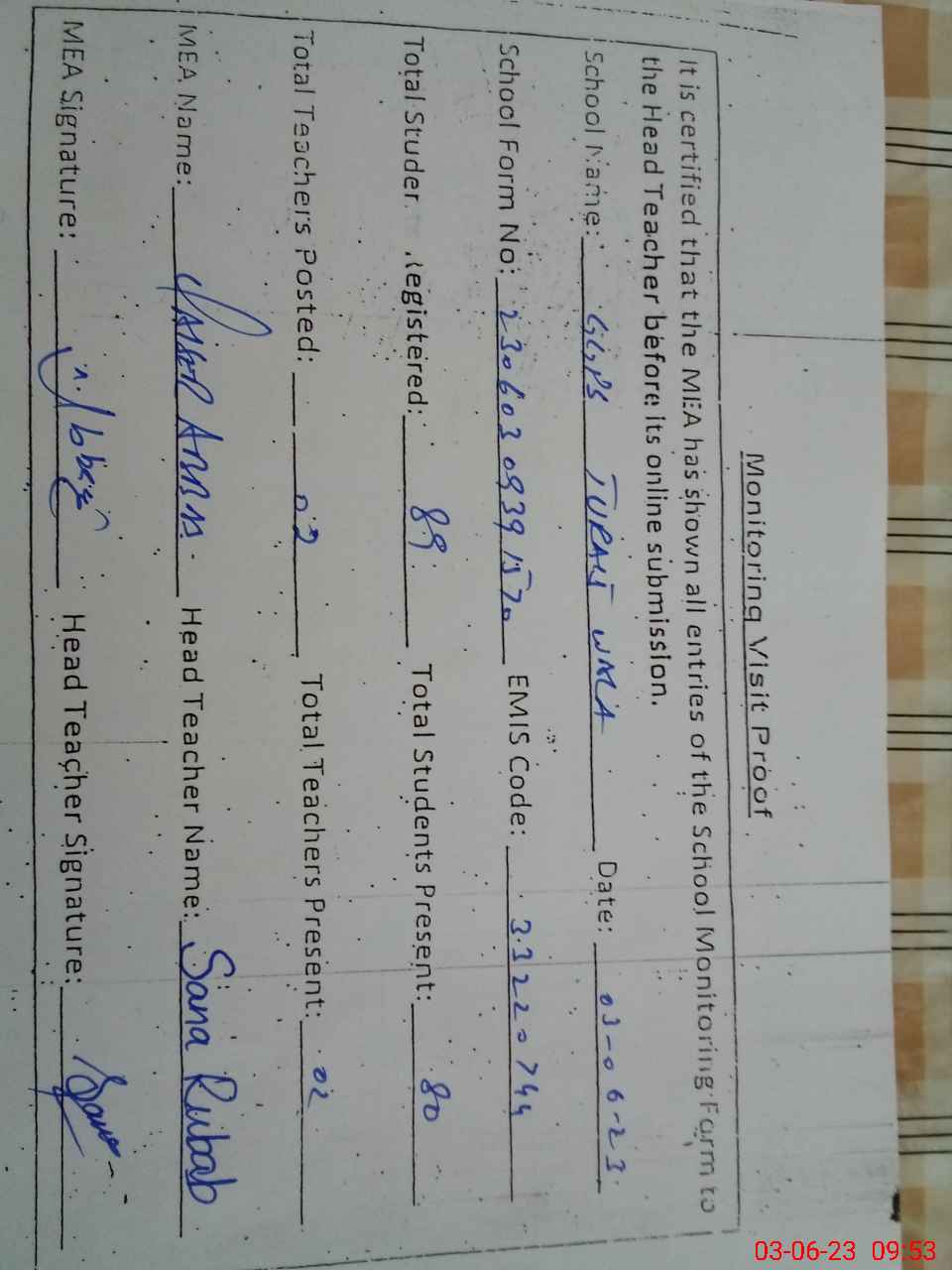 | Attendance Register | Head Teacher | MEA with School | Visit Proof |