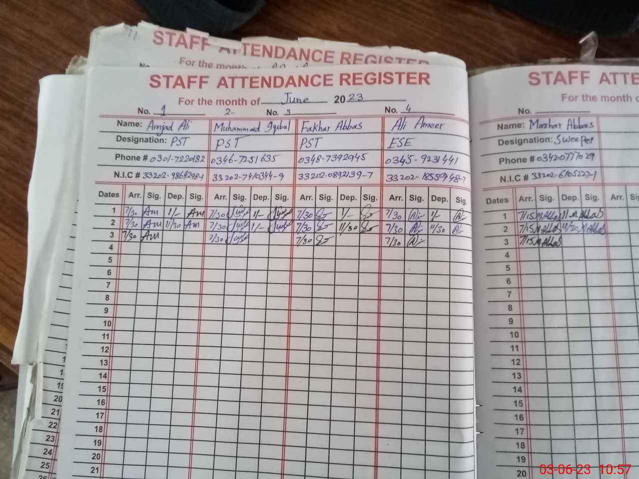 | CNIC | Full Name | Designation | R/C | Absence during last cal. month |