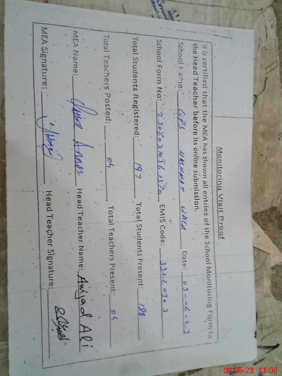 | Attendance Register | Head Teacher | MEA with School | Visit Proof |