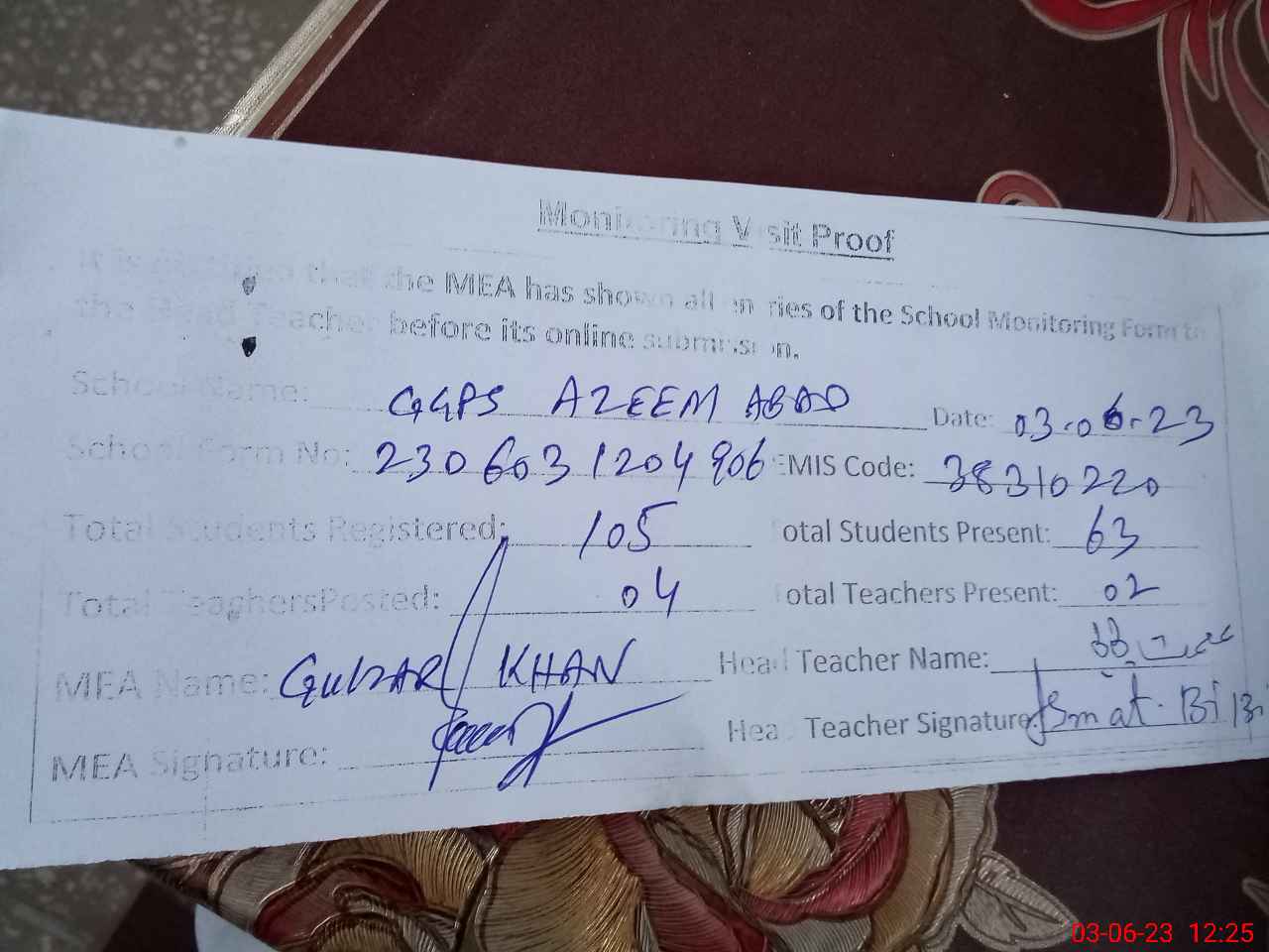 | Attendance Register | Head Teacher | MEA with School | Visit Proof |