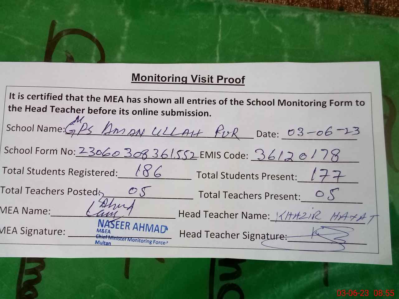 | Attendance Register | Head Teacher | MEA with School | Visit Proof |