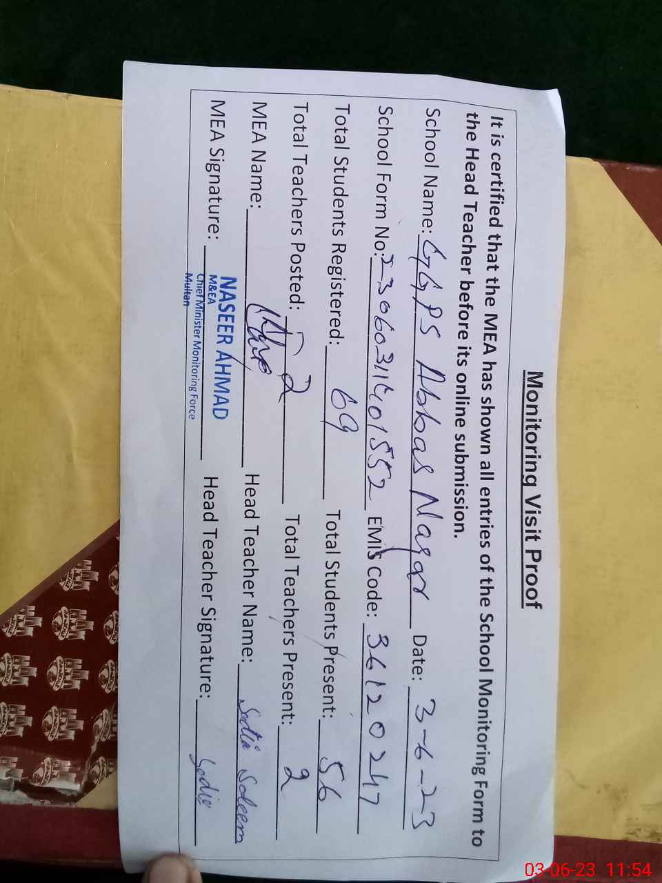 | EMIS Code: 36120247 | Name of School: GGPS ABBAS NAGAR MUZA JALALPUR KHAKHI | |||