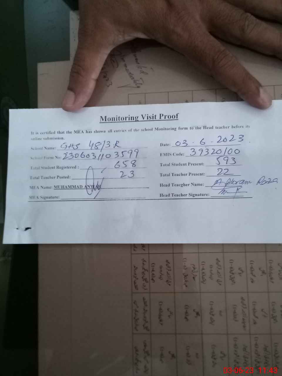| Attendance Register | Head Teacher | MEA with School | Visit Proof |