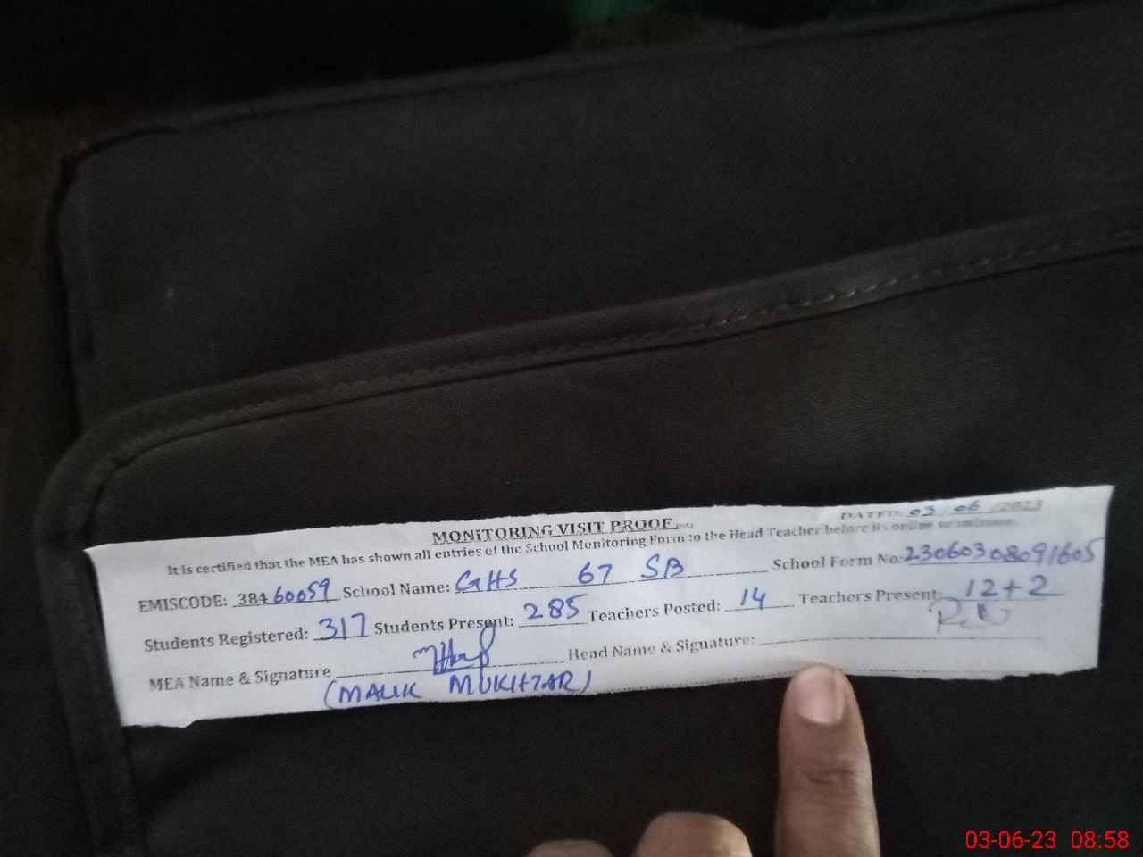 | EMIS Code: 38460059 | Name of School: GHS CHAK NO.67 SB | |||