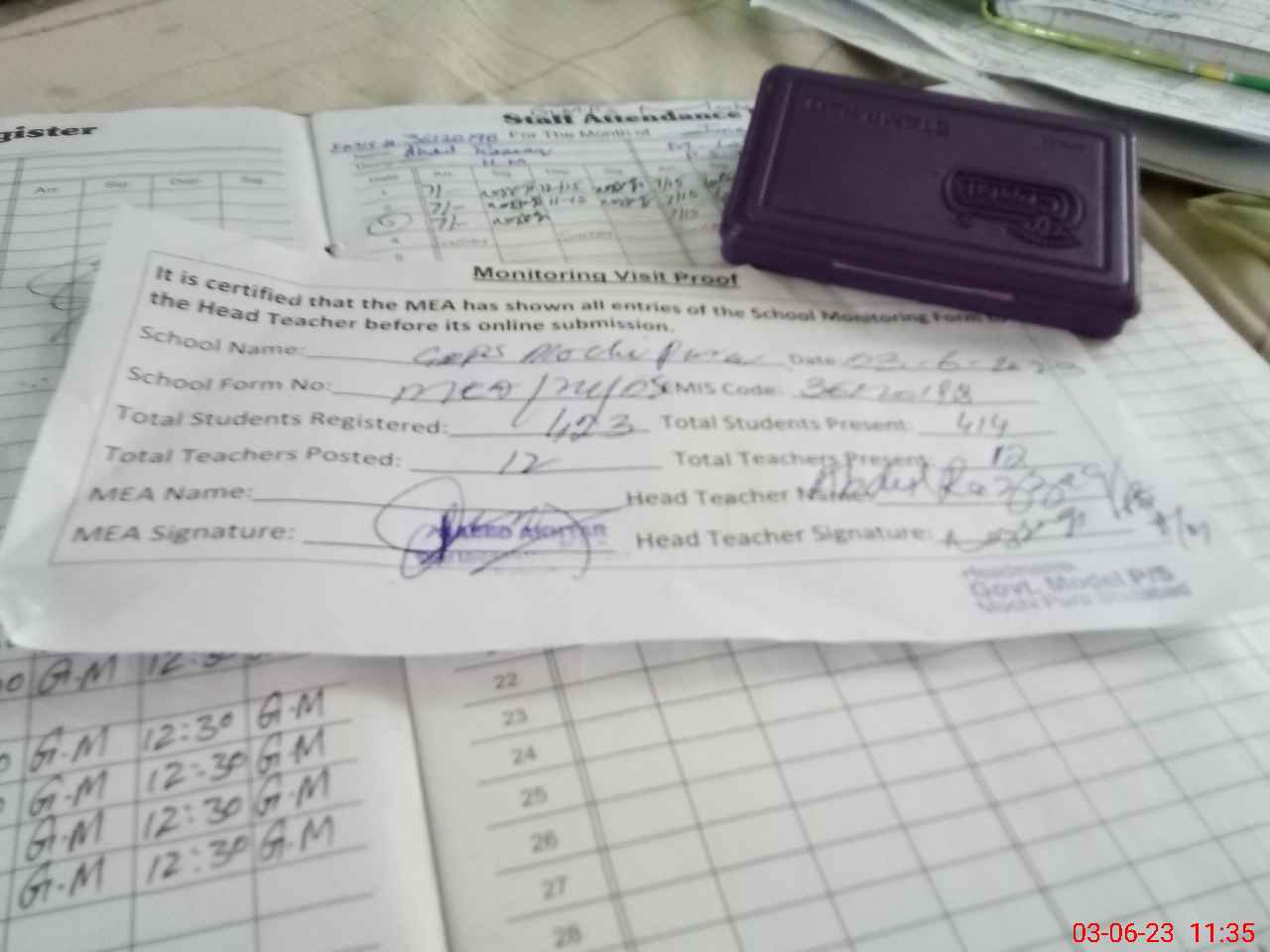 | Attendance Register | Head Teacher | MEA with School | Visit Proof |