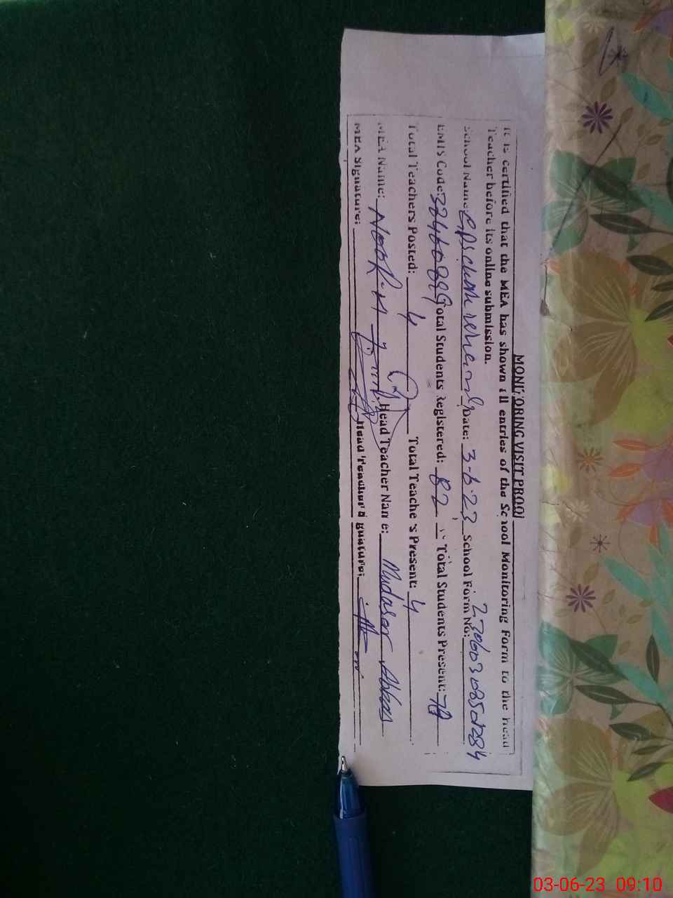 | Attendance Register | Head Teacher | MEA with School | Visit Proof |