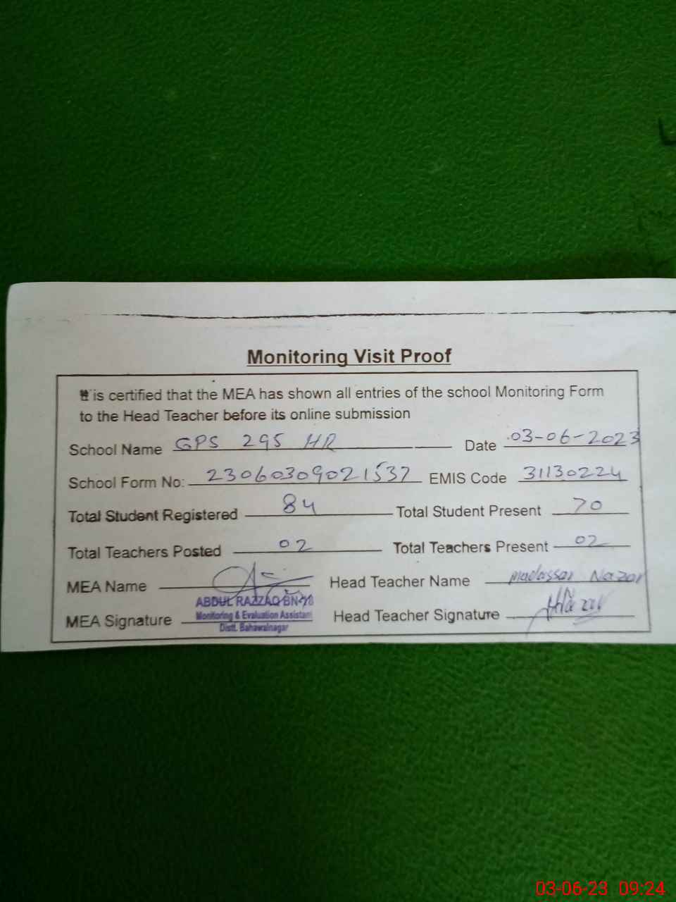 | EMIS Code: 31130224 | Name of School: GPS CHAK NO 295 HR | |||