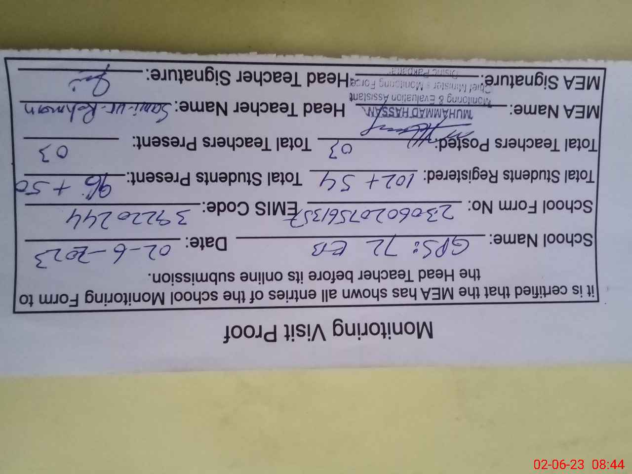 | Attendance Register | Head Teacher | MEA with School | Visit Proof |