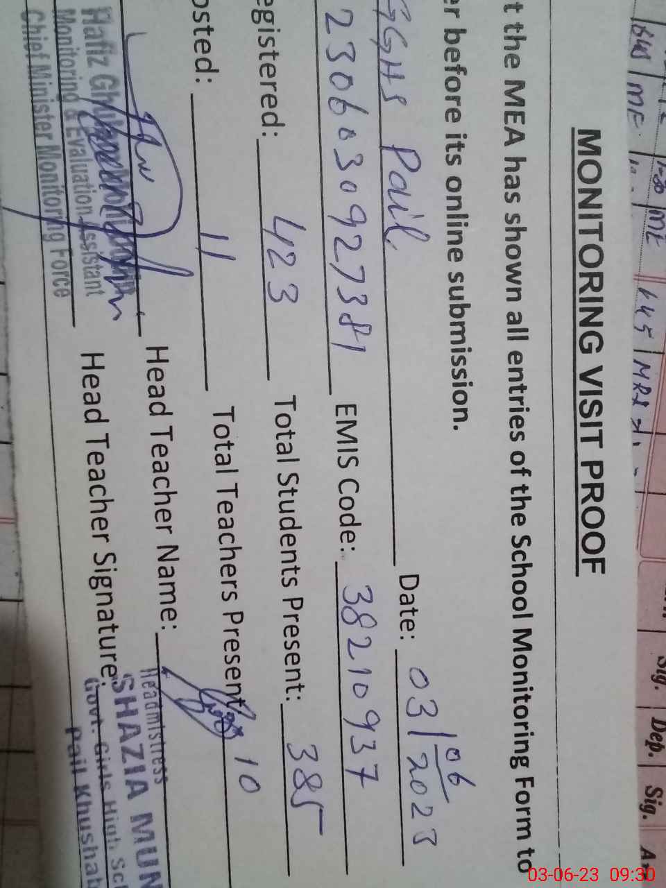 | Attendance Register | Head Teacher | MEA with School | Visit Proof |