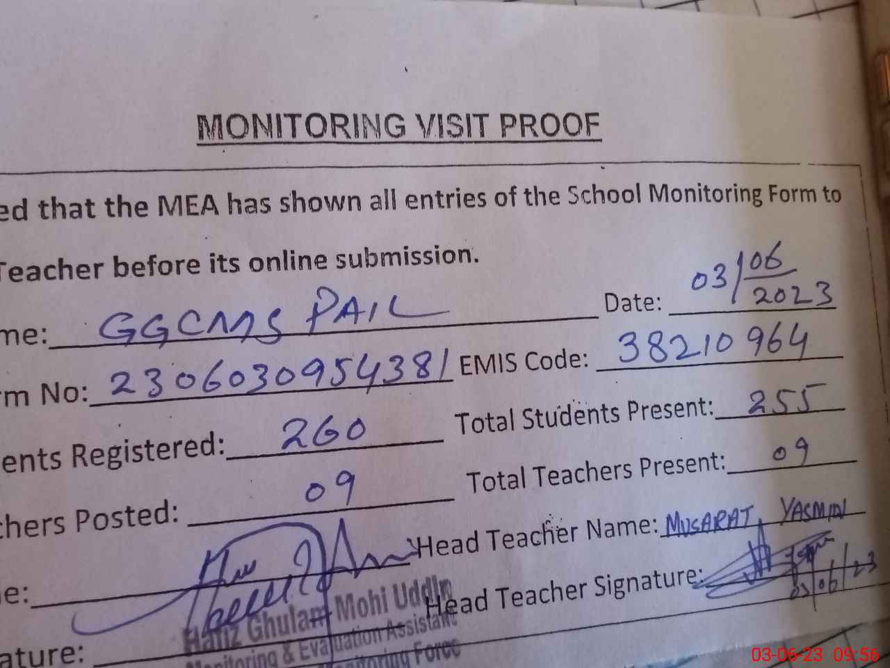 | Attendance Register | Head Teacher | MEA with School | Visit Proof |