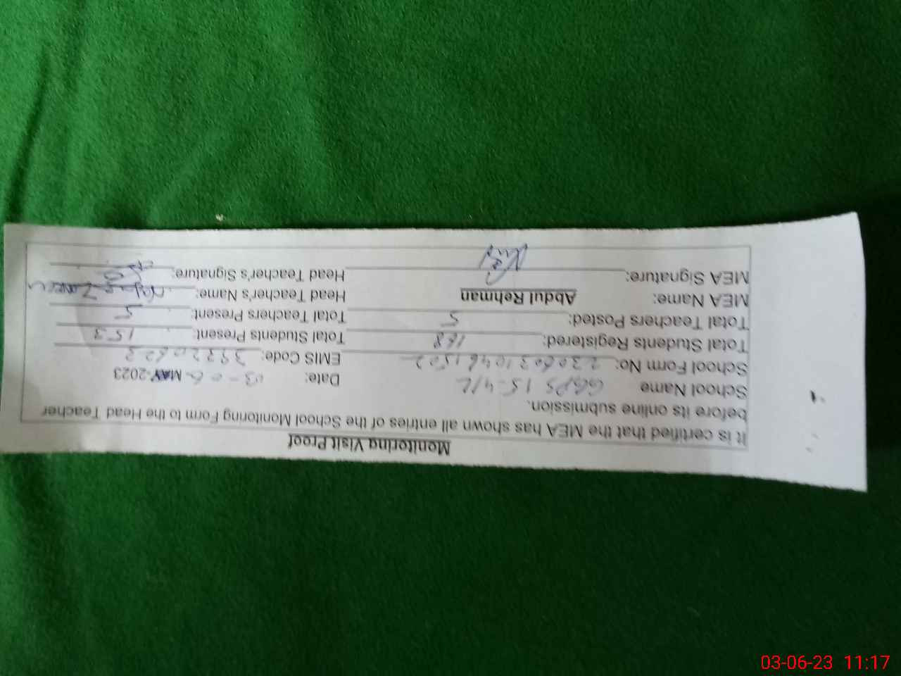 | Attendance Register | Head Teacher | MEA with School | Visit Proof |