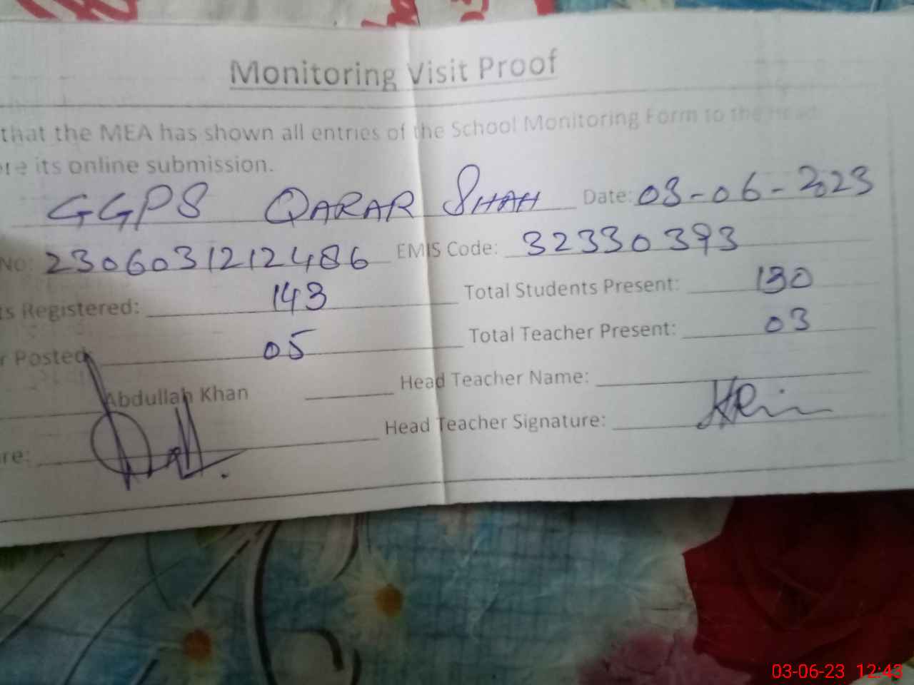 | Attendance Register | Head Teacher | MEA with School | Visit Proof |