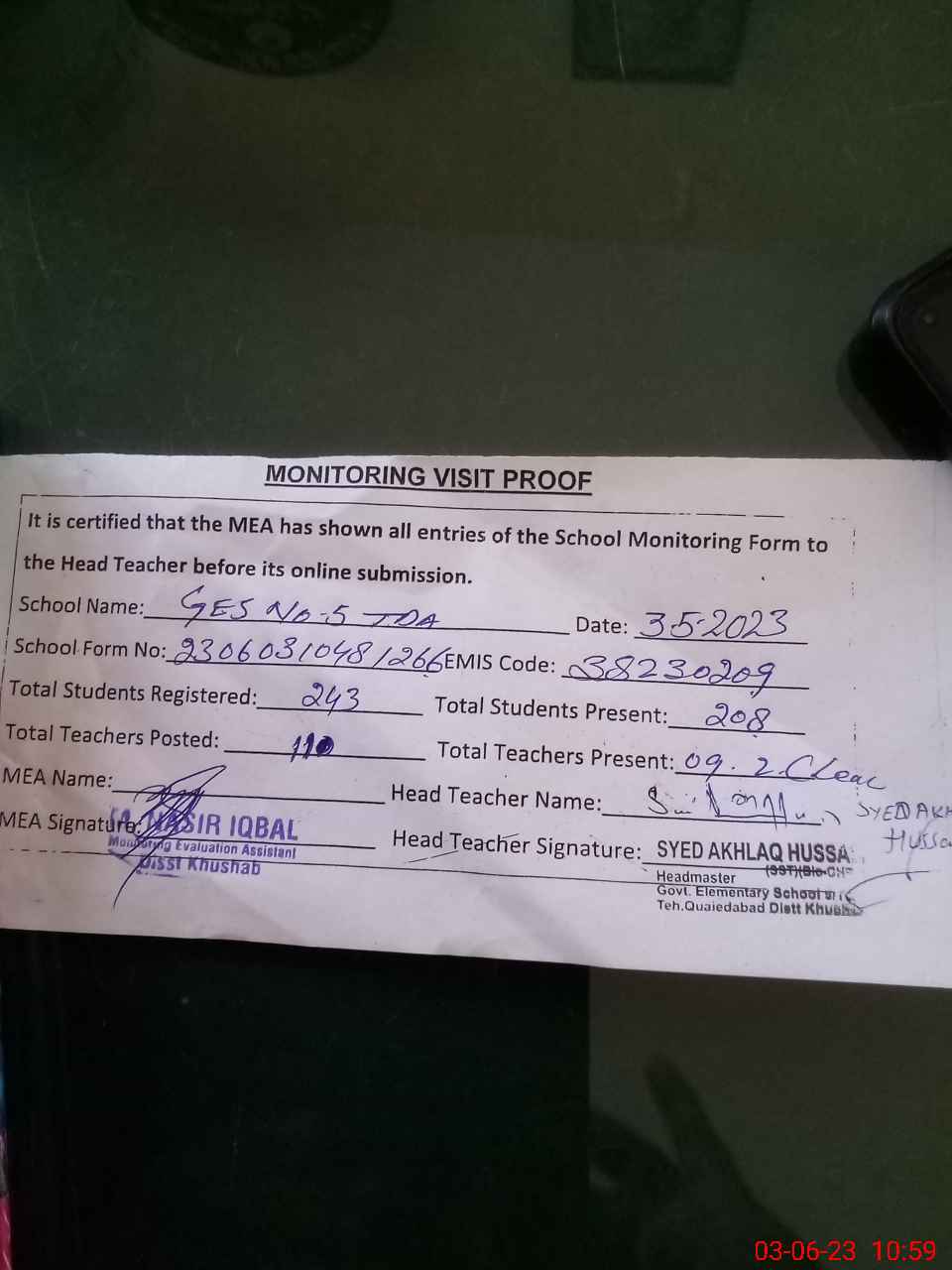 | EMIS Code: 38230209 | Name of School: GES CHAK NO. 5 TDA | |||