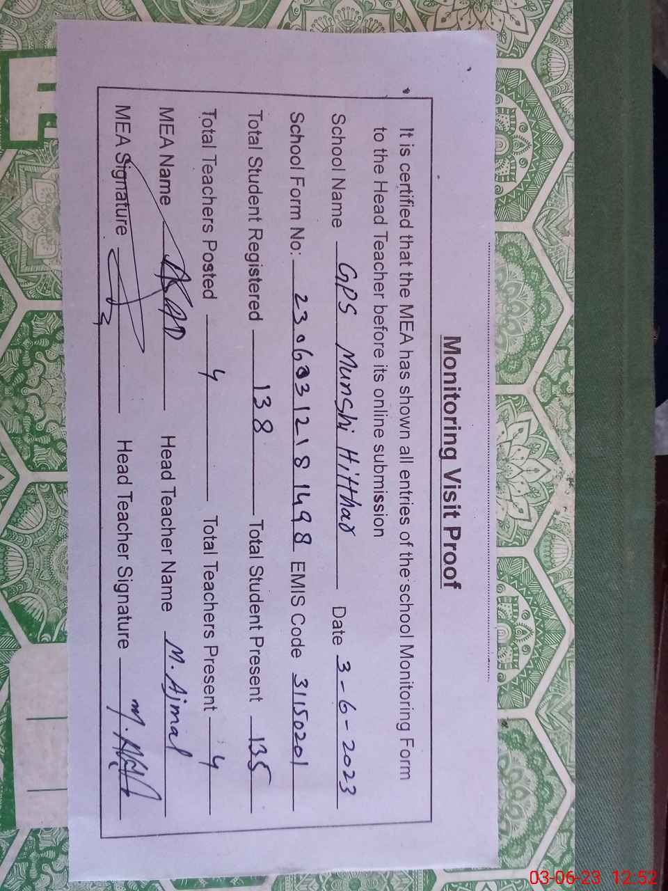 | Attendance Register | Head Teacher | MEA with School | Visit Proof |