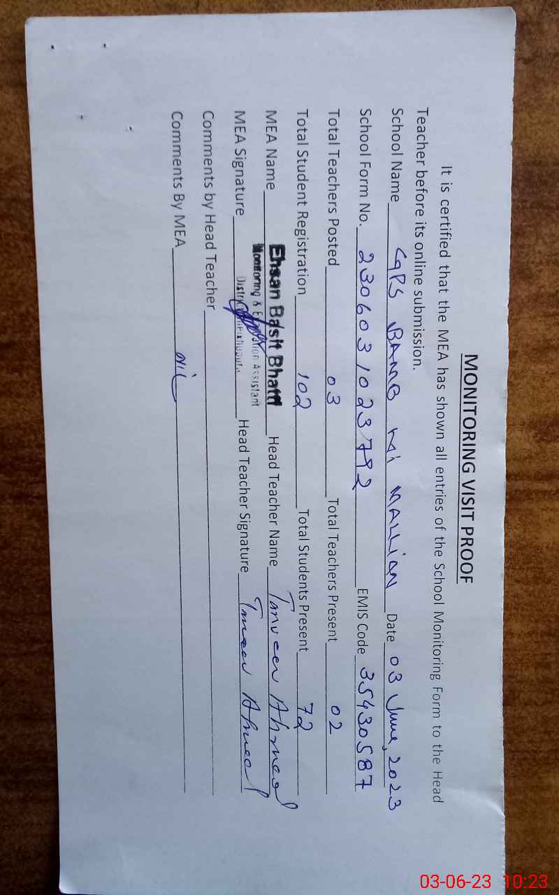 | EMIS Code: 35430587 | Name of School: GPS BAMBKI MALLIAN | |||