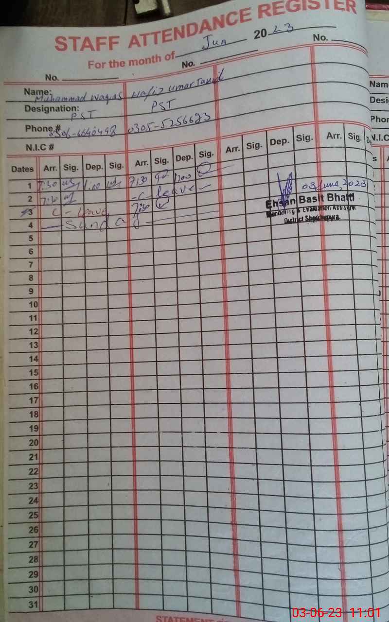 | CNIC | Full Name | Designation | R/C | Absence During Last Calender Month |